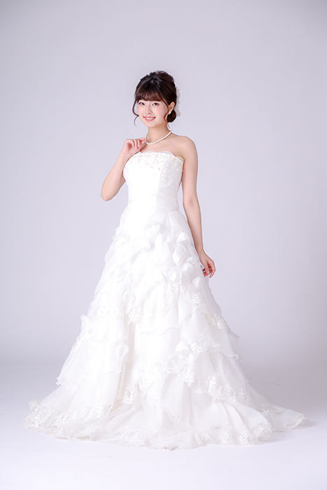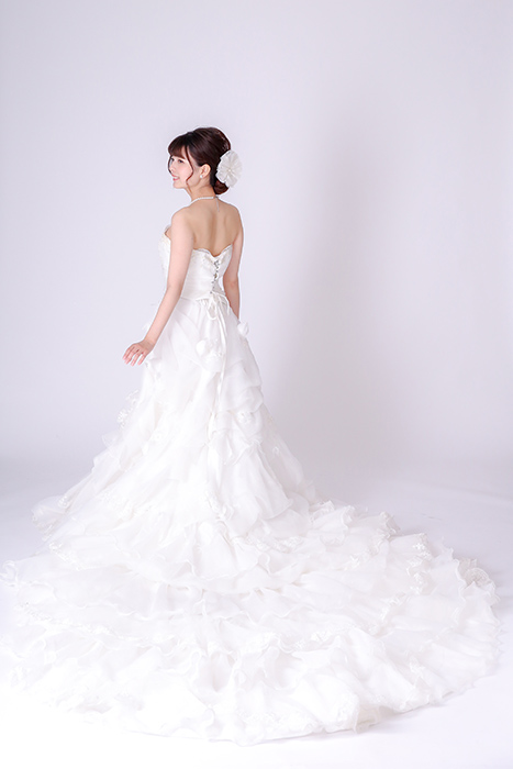 胸元にビジューが付いているので顔周りが華やかになります。トレーンが長いので後ろ姿の撮影にも向いているドレスです。