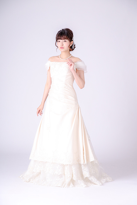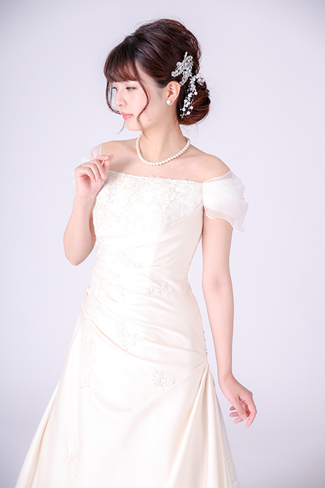 肌が明るく見えるアイボリー色のドレスです。サテン生地にレースを重ねて大人っぽいデザインです。