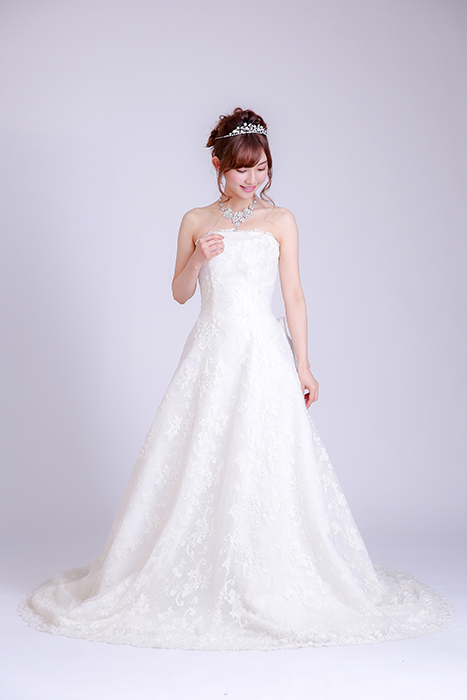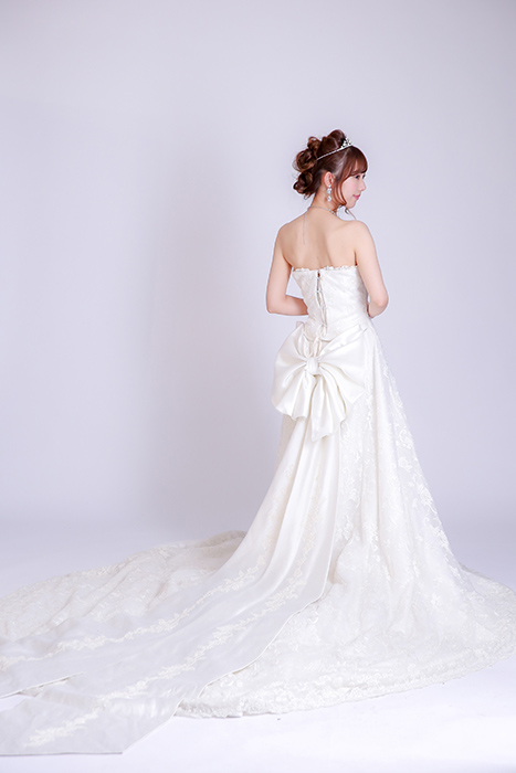 王道のAラインドレス。後ろにはリボンがあしらわれトレーンが長く、後ろ姿も美しいデザインです。