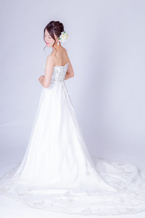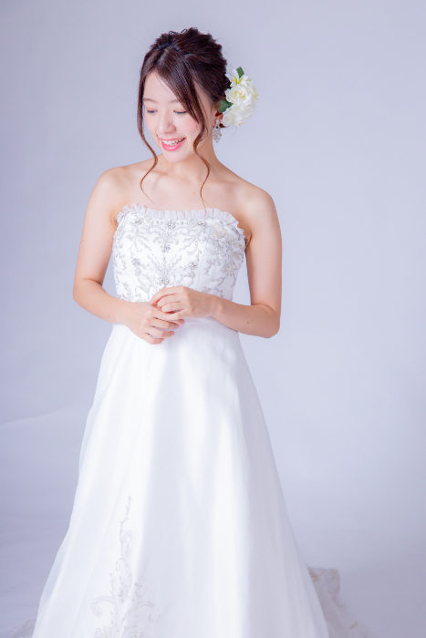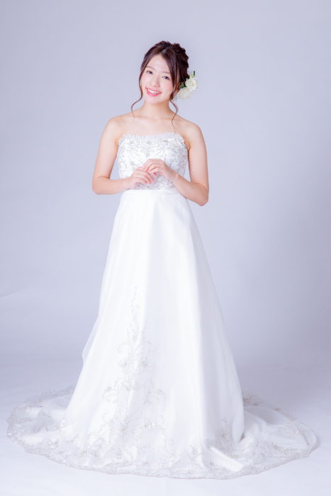 切り替えが高い位置にあるので脚長効果があります。胸元にレース、ビジューが施されているので華やかなドレスです。