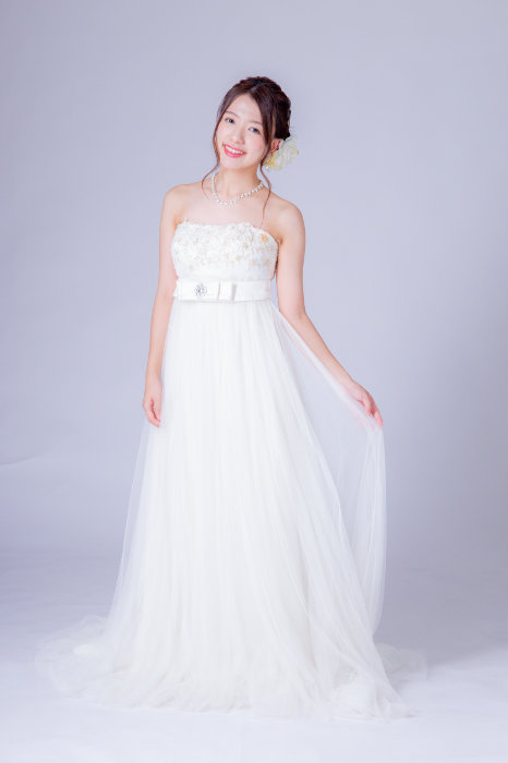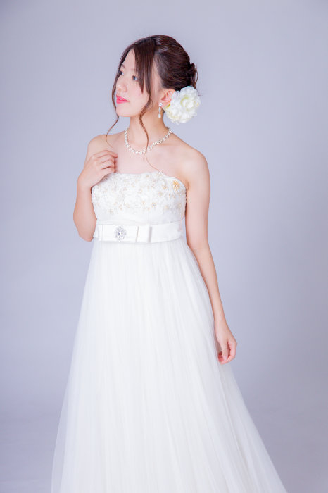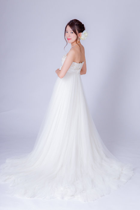 エンパイアラインのドレスはウエストの切り替えが高いので脚長効果があります。チュール素材なので優しい印象になります。