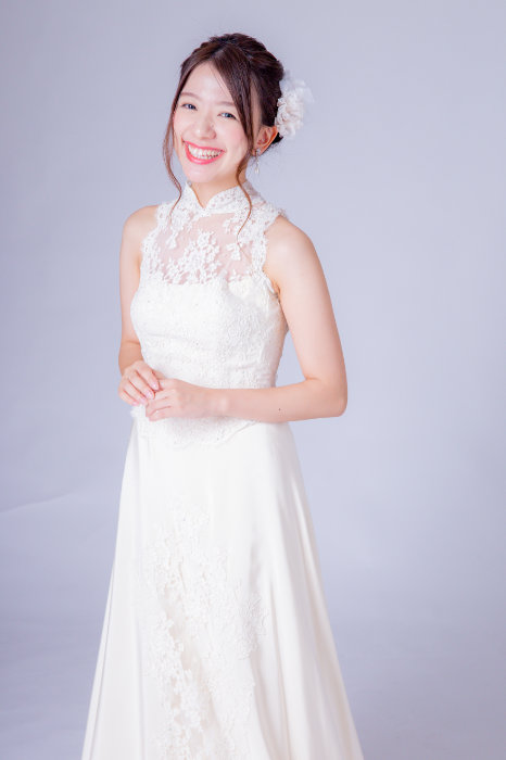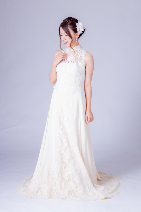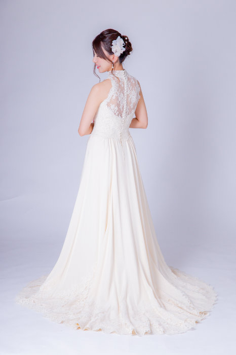 肌が明るく見えるアイボリー色のドレスです。胸元が隠れるハイネックのデザイン、後ろに付けたくるみボタンが上品な印象になります。